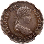 Bolivia. ½ Real, 1825-JL (Potosi). KM-90. Ferdinand VII. Laureate head right. Sharply struck with deep iridescent toning. NGC graded MS-64.