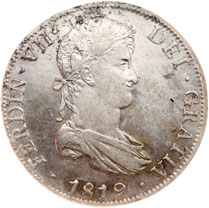 Chile. 8 Reales, 1812-So FJ. Eliz-70; KM-80. Ferdinand VII. Laureate bust right. Reflective fields with brilliant mint luster. Difficult to locate in top grades. NGC graded AU-58.