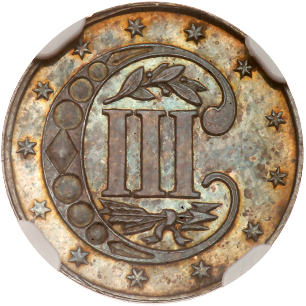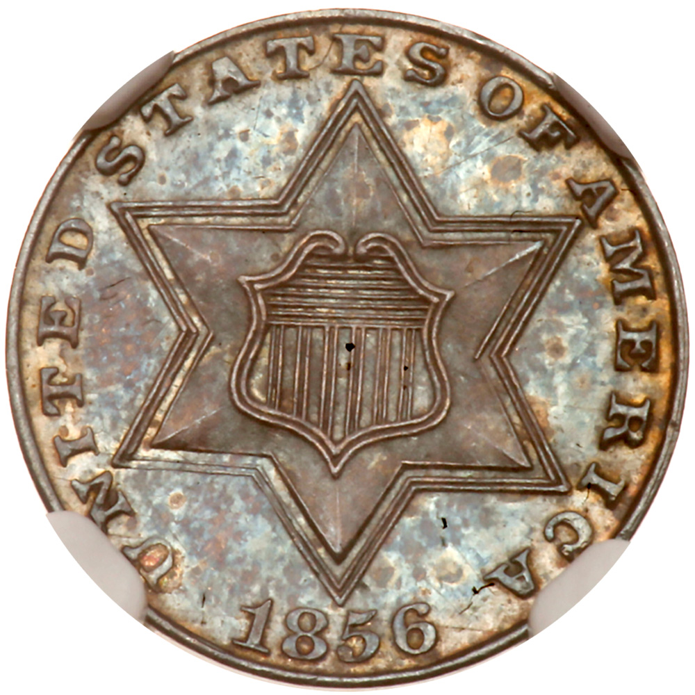 1856. NGC graded Proof 65. Lovely blue toning. This is one of the finer examples of this early proof issue and a gem that will enhance any specialized collection. The surfaces are pleasing as the mirror finish is fresh and undisturbed while the fine nuances of the devices all show bold striking and ample mint frost. An opportunity for the date collector to secure one of these seldom seen proof issues. Only 60 struck. Pop 5; 2 finer in 66.
