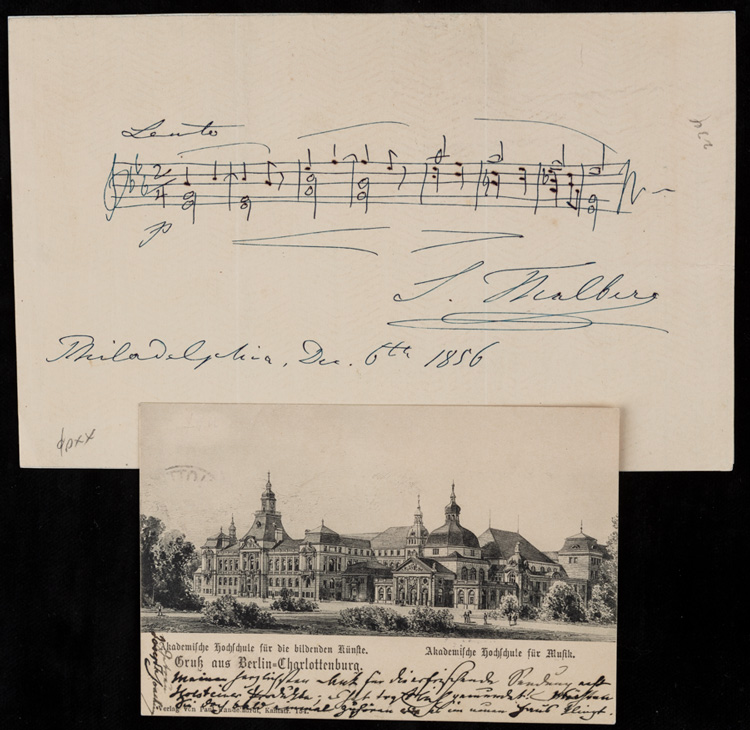 With Sigismond Thalberg (1812-1871) Viennese Piano Virtuoso and Composer. Autograph musical quotation signed, "S. Thalberg, one page, 5 x 8", Philadelphia, Dec. 6th, 1856. Written during his first American tour, this is an untitled excerpt marked "Lento" at top. Liszt once paid him the compliment: "Thalberg is the only artist who can play the violin on the keyboard." Fine. Estimate Value $300 - UP