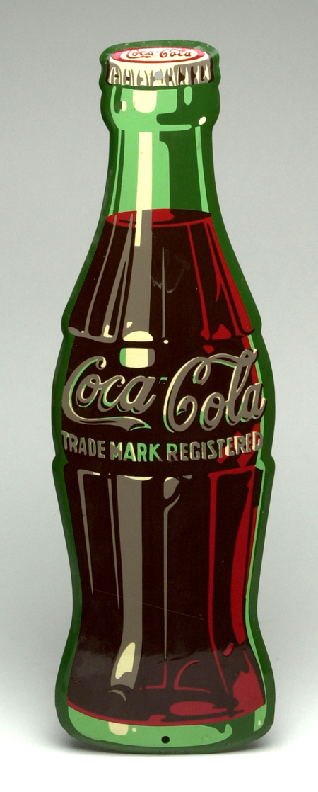 [Soft Drink Related]. Coca-Cola Bottle Sign. 1940s Coca-Cola bottle sign. Resembling the "hobble skirt" style bottle, this sign effectively advertises the refreshing elixir with an oversized Coca-Coal bottle. Height: 17". With a light, horizontal surface scratch across bottom, and a few small surface abrasions. Overall, in very good condition.