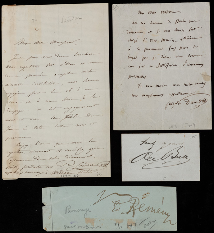Musicians: Ole Borneman Bull, Karl Youlevitch Davidov, Edward Remenyi, Prosper Sainton. Group of four musicians: Ole Borneman Bull (1810-1880) Card inscribed and signed, "truly yours Old Bull" by the Norwegian violinist, on 2 x 3¼" card, no place, no date. Karl Youlevitch Davidov (1838-1889) Russian cellist. Autograph letter signed, one page, in French, 5¼ x 4", no place, no date. To his "dear neighbor" saying he would be obliged if she would attend next time in the lodge, which he wants to offer her because he needs to honor old promises. Edward Remenyi (1830-1898) Signature of the Hungarian violinist on 1¾ x 5½" paper, no place, no date; with a few lines of a letter on the back. Prosper Sainton (1813-1890) Autograph letter signed by the French violinist, one page, 7¼ x 4½", no place, no date, regretting not being able to accept an invitation because he has an engagement and explaining why. Small paper loss at left margin affects a couple of letters. Group very good to fine condition. Estimate Value $200 - UP