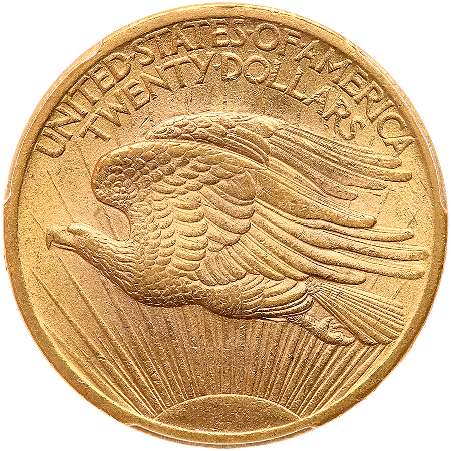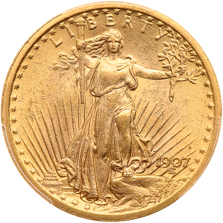 1907 $20 St. Gaudens. Flat Relief PCGS MS62. PCGS graded MS-62. Mostly untoned (PCGS # 9141) Estimated Value $1,300 - 1,350
