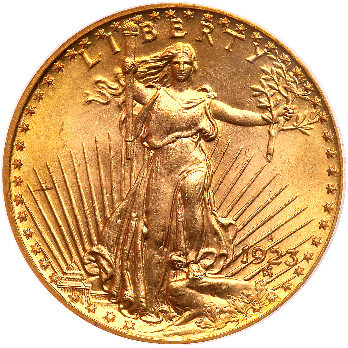 1923-D $20 St. Gaudens PCGS MS65. PCGS graded MS-65 PQ. CAC. Rich golden toning (PCGS # 9176) Estimated Value $1,800 - 1,900