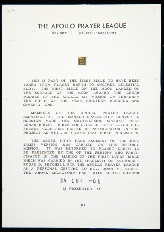 The microfilm finally touched down on the lunar surface in the pocket of Apollo 14 Lunar Module pilot Edgar Mitchell's spacesuit. After the flight's return, each microfilmed Bible was cut into 50 page segments and presented to members of the Apollo Prayer League's "Honor Roll," including League Founder Rev. John Stout and his second-in-command, Harold Hill (a biomedical administrator at NASA). This segment, mounted on a descriptive presentation card (5x7"), was among those remaining in Hill's possession at the time of his passing in 1982.