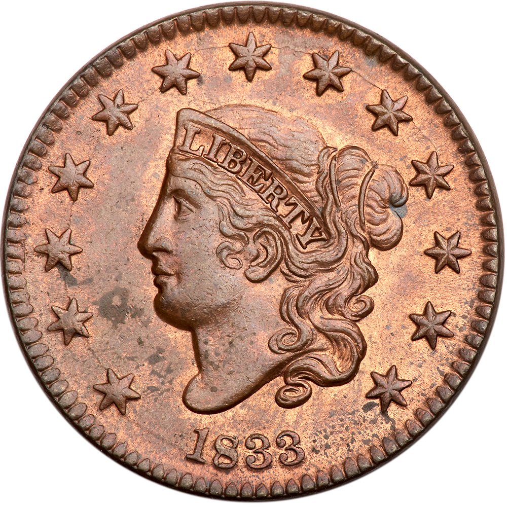 1833 N-5 R1 Repunched 8 PCGS graded MS64 Red & Brown. Lustrous mint red fading to medium brown and steel with more than half the mint color remaining. The only marks are some small splashes of darker chocolate brown toning on both sides, the largest of these in the field between star 3 and the chin. LDS. Both dies are cracked and the stray 8 hidden in the dentils under the normal 8 is gone. The repunching at the top of the normal 8 is dull but visible and the repunching at ICA is nearly gone. The reverse is rotated 30 degrees clockwise relative to the normal head-to-foot die orientation. Our grade is MS63. The attribution and Ahumada provenance are noted on the PCGS label. PCGS population 2; 3 finer in 65 for the variety. PCGS #37031. Estimate Value $1,500 - UP
