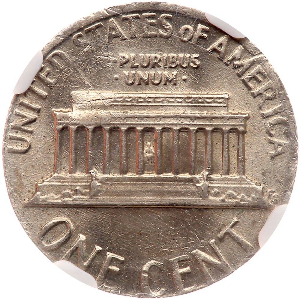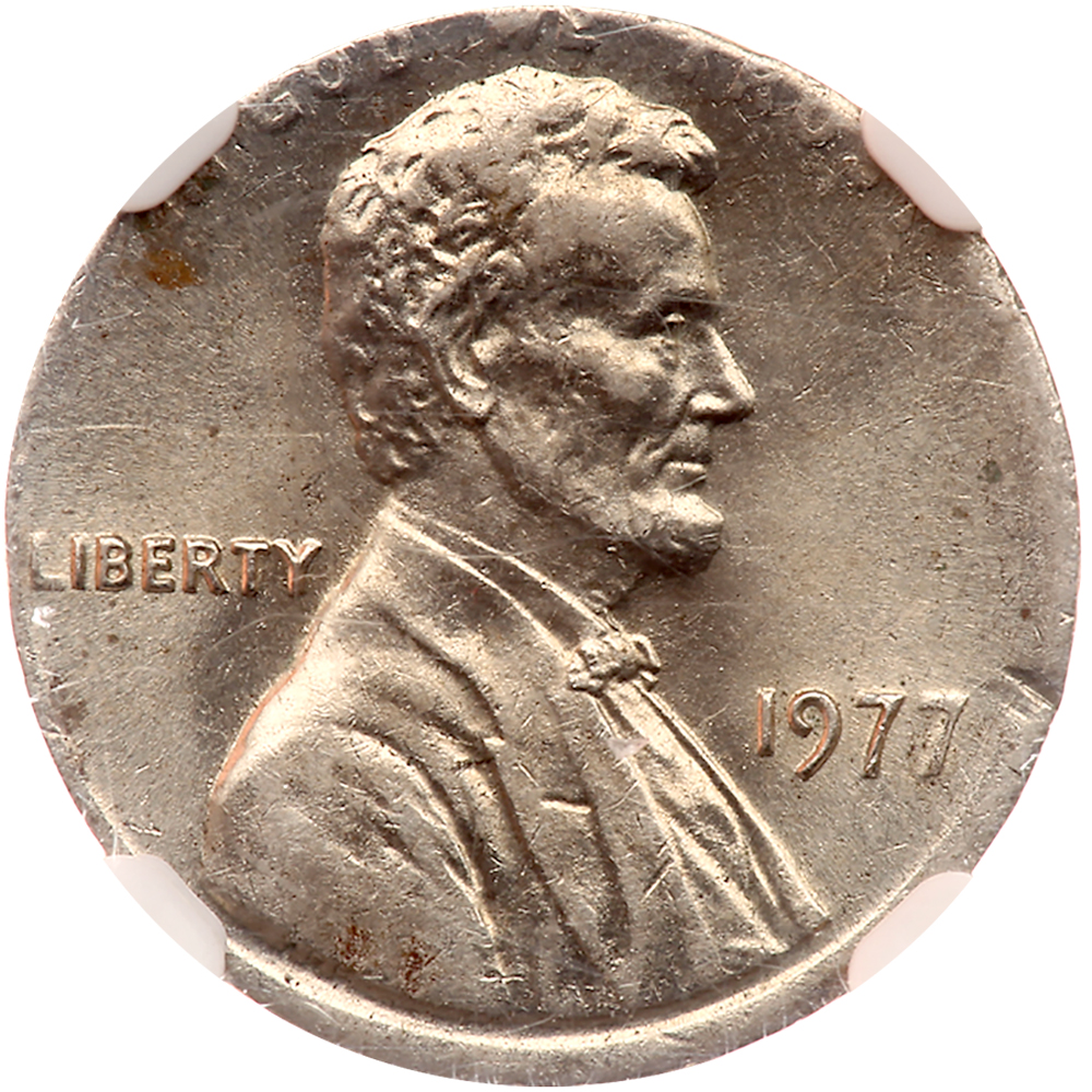 1977. NGC graded Mint Error AU-55. 1¢ struck on a 10¢ blank. 2.3 grams. A scarce mint error and this one is nearly Mint State, but apparently escaped into circulation for a brief time. The surfaces are clean, and the strike a trifle soft due to the thin dime planchet used instead of the intended thicker copper cent planchet.