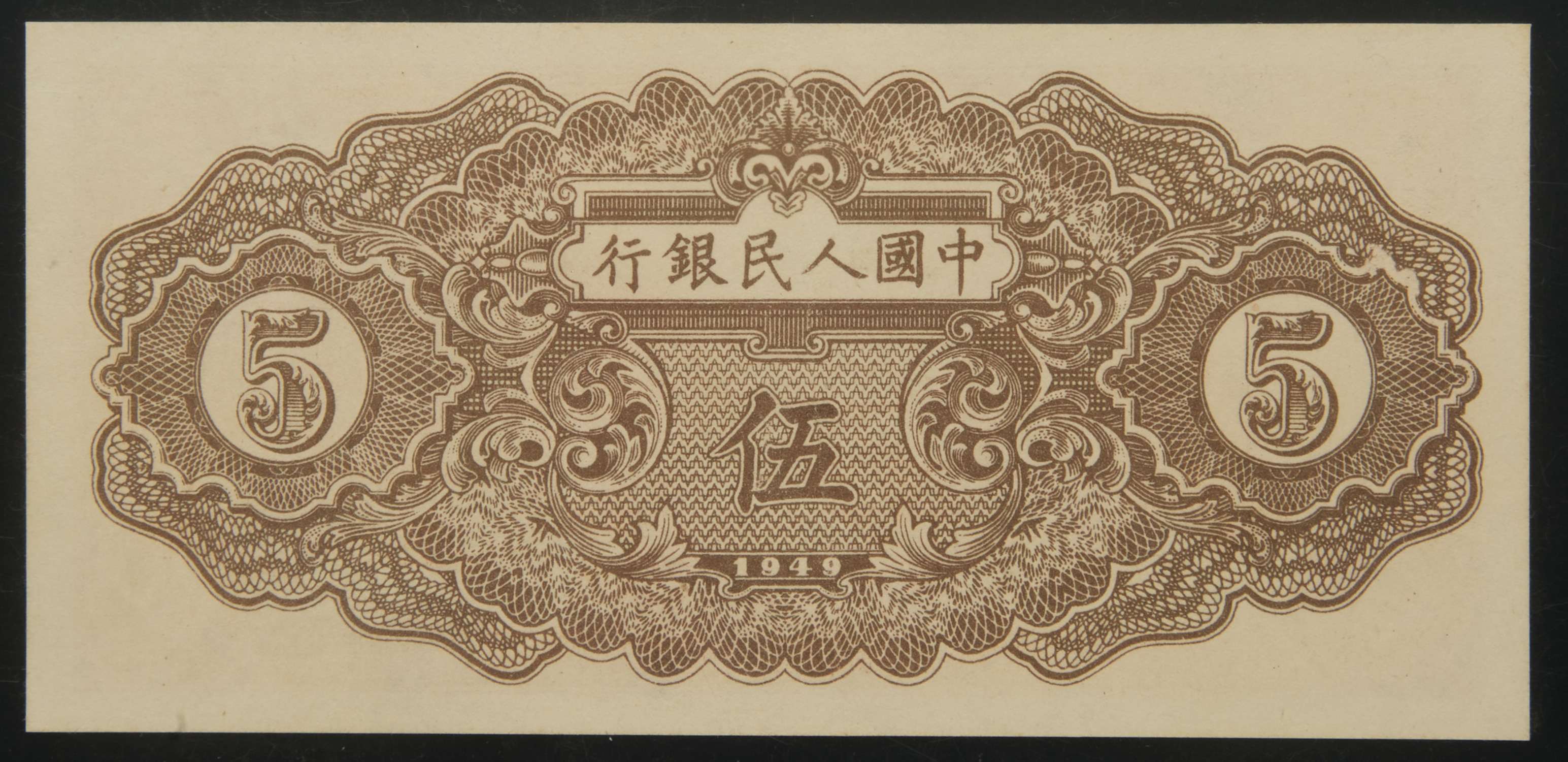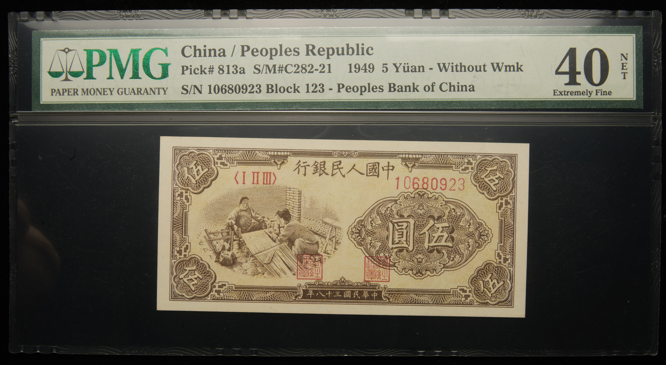 China-Peoples Republic. 5 Yuan, 1949. Pick#813a, S/M#C282-21. S/N 10680923 Block 123. Peoples Bank of China. Without Water Mark. PMG graded 40 Net (Paper Pulls) Extremely Fine. Estimated Value $400 - UP