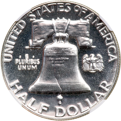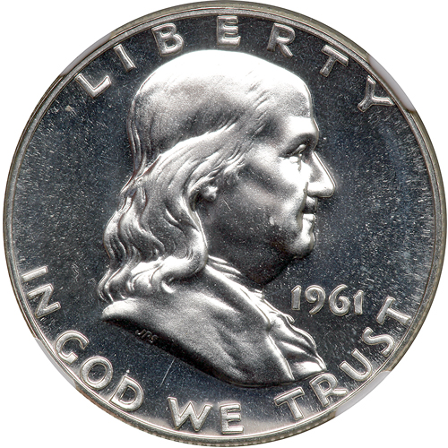 1961. Doubled Die. NGC graded Proof 67. The 1961 Doubled Die Reverse Half Dollar is one of the most dramatic, exciting, and valuable of all Franklin Half Dollar rarities. There may be other lesser Doubled Die Reverses for this year, but they pale by comparison with this dramatic doubled die, being far less bold in the doubling. Strong doubling of E PLURIBUS UNUM, UNITED STATES, and HALF DOLLAR. Pop 23; none finer at NGC. Estimated Value $5,000 - 7,500