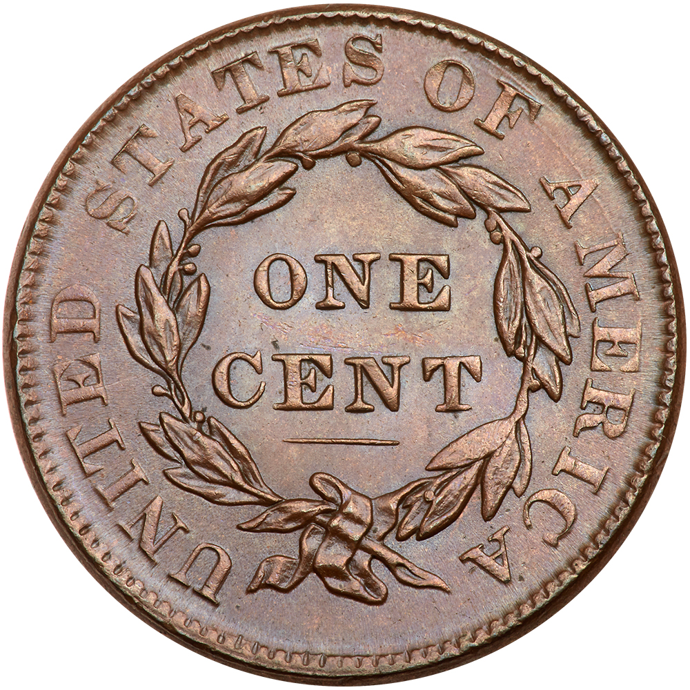 1837 N-1 R3 Plain Hair Cord, Medium Letters PCGS graded MS64 Brown, CAC Approved. Very attractive uniform lustrous light chocolate brown with subtle overtones of light bluish steel. Satiny and nearly flawless to the unaided eye, but there are a few minor marks. The notable ones are a microscopic speck of carbon in the field off the upper lip and a collection of very light abrasions over EN in CENT. MDS. The fields show fine die flowlines and the die line over F is dull but still easily visible. Graded MS61 and tied for CC#3 in the Noyes census, his photo #22837. Bland says MS60+ and tied for CC#5. Our grade is MS62. Comes with a nice provenance. The attribution and Norweb-Ahumada provenance are noted on the PCGS label. PCGS population 1; finest BN of the variety. PCGS #37147. Estimate Value $1,500 - UP