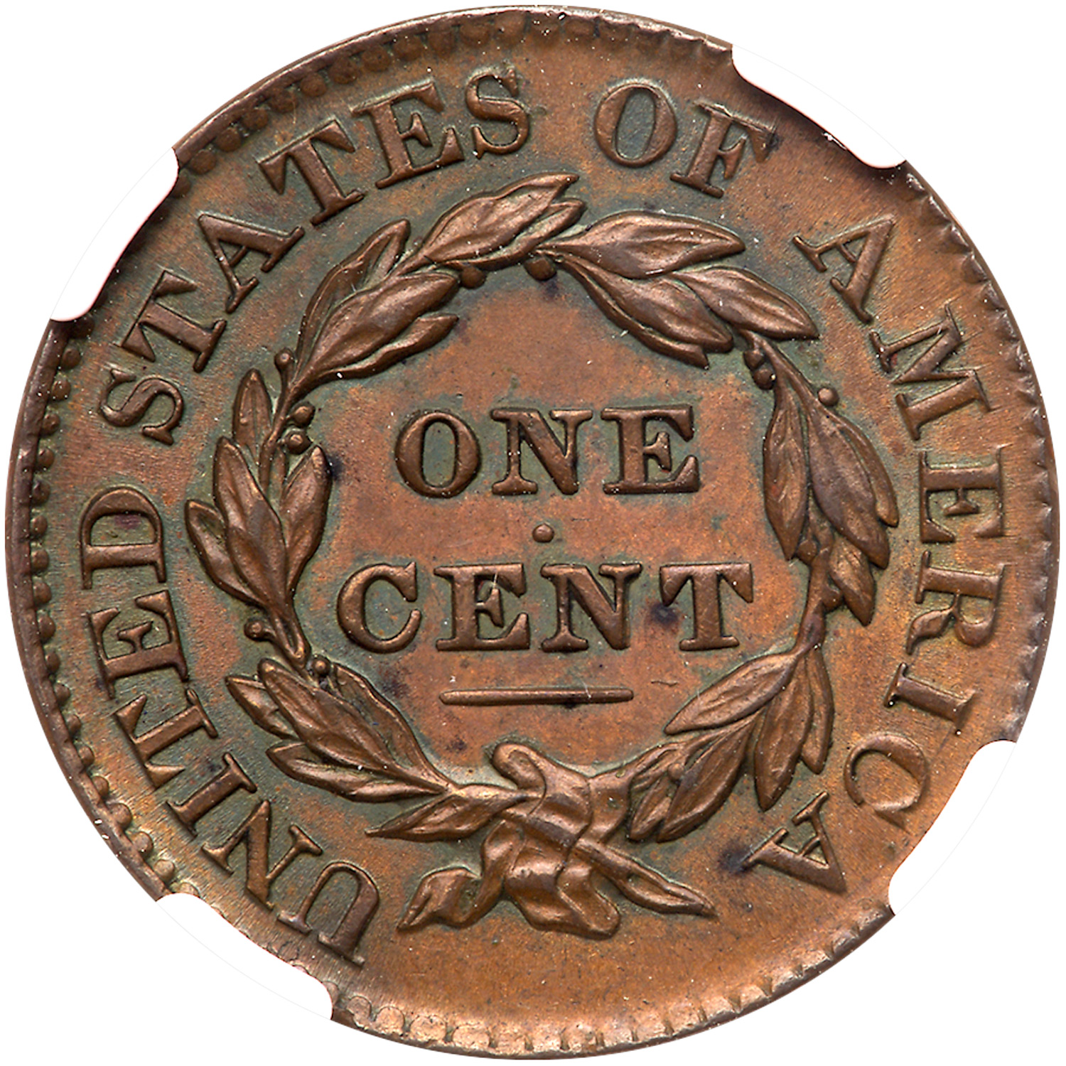 1827 N-1 R2 NGC graded MS63 Brown. Frosty tan and light brown with steel brown toning on the highpoints. Satiny luster shows in the fields on both sides and this cent has mint state eye appeal in spite of a touch of rub on the highest points of the devices. The only notable marks are a small spot of darker toning under the left top of the T in CENT and another on the right foot of the second A in AMERICA. E-MDS. There are fine radial die flowlines in the fields off the dentil tips but no crumbling in the dentils at stars 5 & 6. Graded AU50 and tied for CC#3 in the Noyes census, his photo #27746. Bland says AU55. Our grade is AU50+. The attribution is noted on the NGC label. Estimated Value $800 - UP