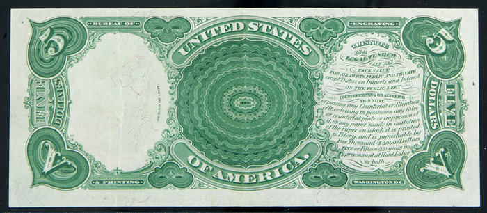 1907, $5 'PCBLIC' Error United States Note. PCGS Extremely Fine 40PPQ. Fr-91. . KL-221. Fully original and pleasing for the grade. The engraving "error" on the back, although minor and not at all scarce, is quite popular among collectors.