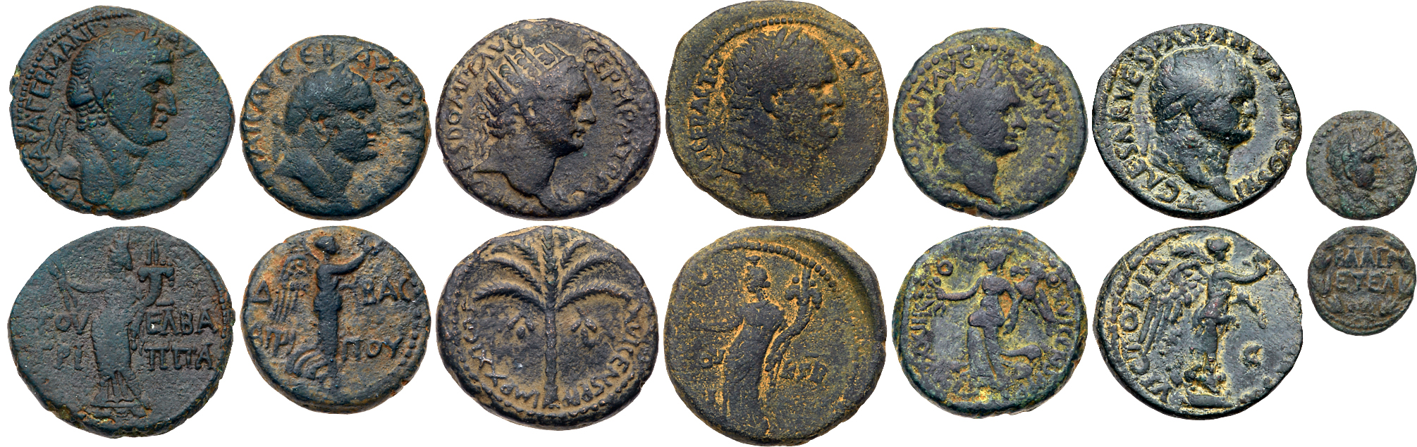 7-piece Herod Agrippa II and Roman Judean. Consists of the following bronzes: H-1282, H-1292, H-1300, H-1303, H-1458, H-1459 and RIC 1039 Coins grade Mostly Very Fine. A very worthwhile group of Judean (PCGS # 7) Estimate Value $600 - UP