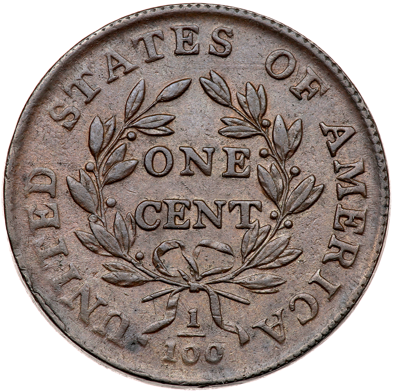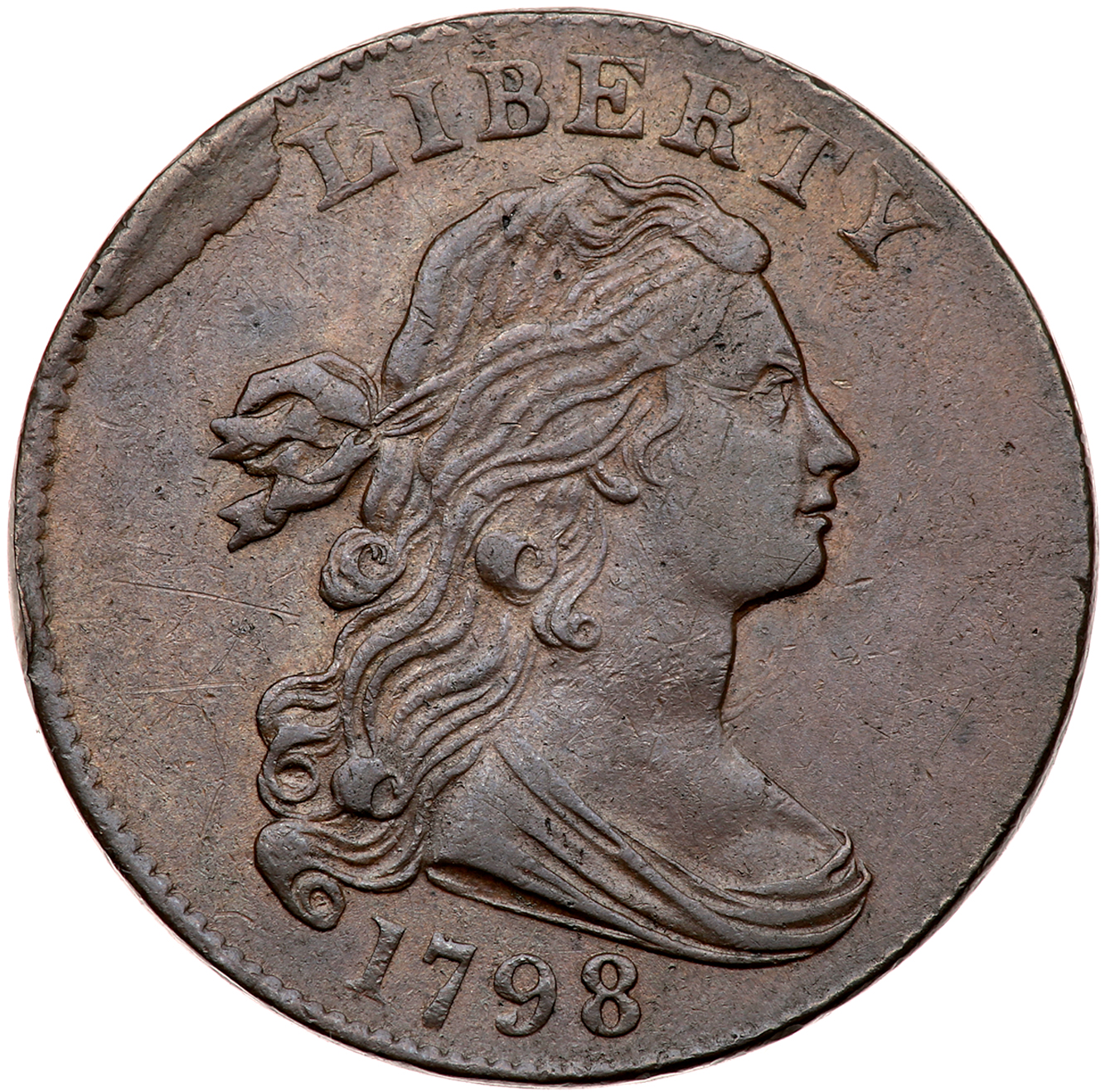 1798 S-171 R4 Style II Hair, Small 8. PCGS graded AU-55. CAC Approved. Attractive frosty medium steel brown with slightly darker steel brown toning on the highpoints and lighter brown and tan in protected areas. Has the look of a mint state cent, but there is a touch of light wear on the highpoints. The only marks are a few microscopic ones on the neck, a couple faint hairlines in the field over the bust tip, a thin nick at the left corner of the eye, and a spot of darker olive brown toning at the left end of the wreath ribbon. MDS, Breen state IV, with a cud break left of the L in LIBERTY. Graded VF35 and tied for CC#3 in the Noyes census, his photo #28384. Bland says VF35 and tied for CC#4. Our grade is EF40. The attribution and Reynolds provenance are noted on the PCGS Secure label. Pop 1; 1 finer in 58 at PCGS for the variety (PCGS # 36083) .