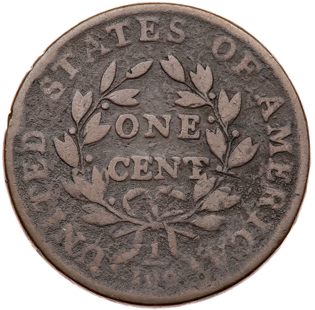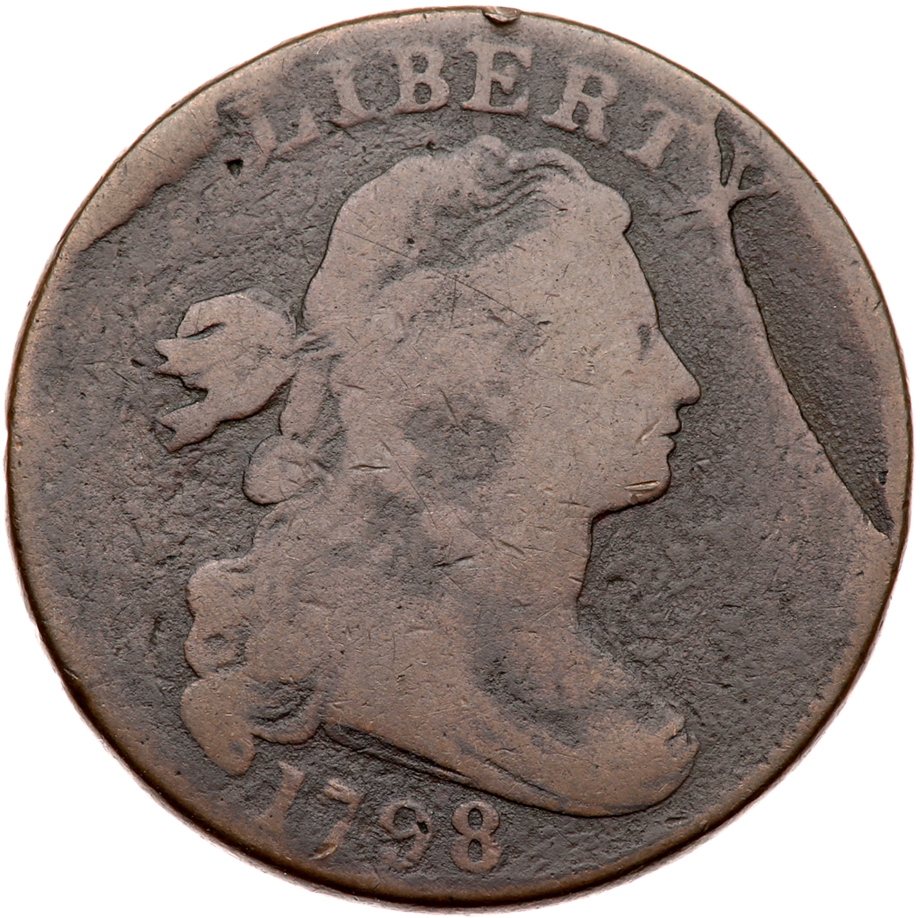 1798 S-171 R4 Style II Hair, Small 8. PCGS graded VG-8. CAC Approved. Rather glossy dark chocolate brown in the fields and protected areas with light chocolate brown toning covering the devices. The two-tone appearance accents the details and this cent offers nice eye appeal for the grade. The devices are smooth but the fields and protected areas are covered with fine granularity. No verdigris, and the only notable mark is a thin nearly horizontal nick on the chin. Extremely rare TDS with a bold die crack arcing through TY ending at the rim before the chin. The area outlined by the crack is a sunken retained cud. The earlier cud break left of the L is clear. A great die state for the serious specialist. Graded VG7 net G5 by Noyes, his photo #36309. The finest TDS example in his census grades F12, and there is very little from which to choose. Our grade is VG7 net G5+. The attribution and Reynolds provenance are noted on the PCGS Secure label. Pop 1; 3 finer at PCGS for the variety, 1 in VF35, 1 in AU55, and 1 in AU58 (PCGS # 36083) .