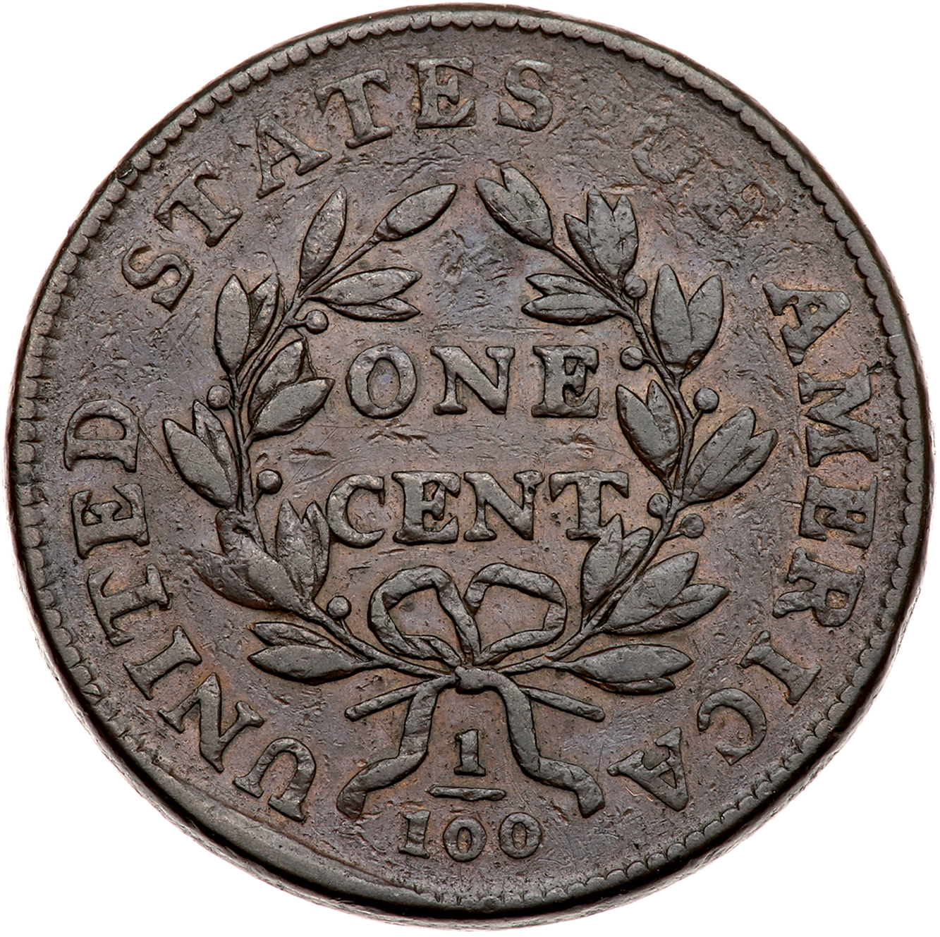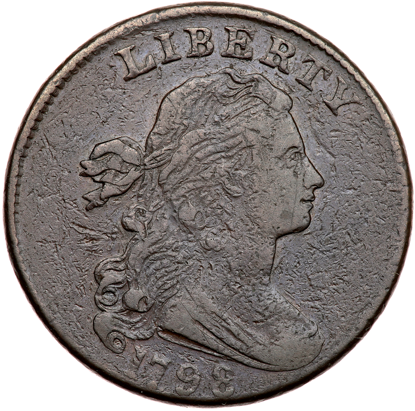 1798 S-175 R3 Style II Hair, Small 8. PCGS graded Fine-15. Glossy medium steel and chocolate brown with frosty lighter brown in protected areas on the reverse. No trace of corrosion or verdigris, but both sides are covered with tiny nicks. None of the marks is significant but there are far too many for the sharpness grade. Very rare E-MDS, Breen state II, with a cud break extending from under the 1 in the denominator to over the left top of the N in UNITED, and this cud does not touch the U. The reverse is covered with fresh nearly vertical die lapping lines. Breen says the die clashmarks on the obverse were polished away in this die state, but there are clear ones around the curl under the hair ribbon. Noyes lists two examples of this die state in his census with net grades of F15 and VG8, and he has not seen this coin. Our grade is VF20+ sharpness net F12. The attribution and Reynolds provenance are noted on the PCGS Secure label. Pop 1; 4 finer at PCGS for the variety, 1 in VF30, 1 in EF45, 1 in MS62, and 1 in MS63+ (PCGS # 36095) .