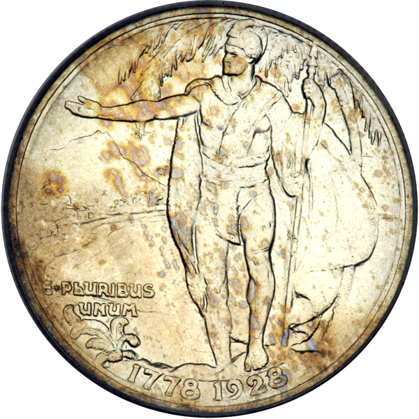 1928 Hawaiian Half Dollar. PCGS graded MS-65+. In a new secure plus holder. Pop 1; 75 finer, 70 in 66, 3 in 66+, 2 in 67. Mostly untoned. A satiny gem. Graceful underlying luster supports pale unevenly distributed gold toning. A pleasing example of the Commemorative which was issued for the 150th anniversary of Captain Cook’s "discovery" (for Europeans, anyway) of the Hawaiian archipelago. Nicely struck, and with excellent detail in hair and jacket, similar fine detail carrying over to the High Chief (no one in particular, just a generic representation of a typical Royal politician of the day).