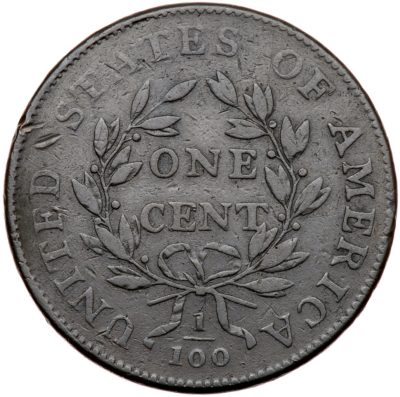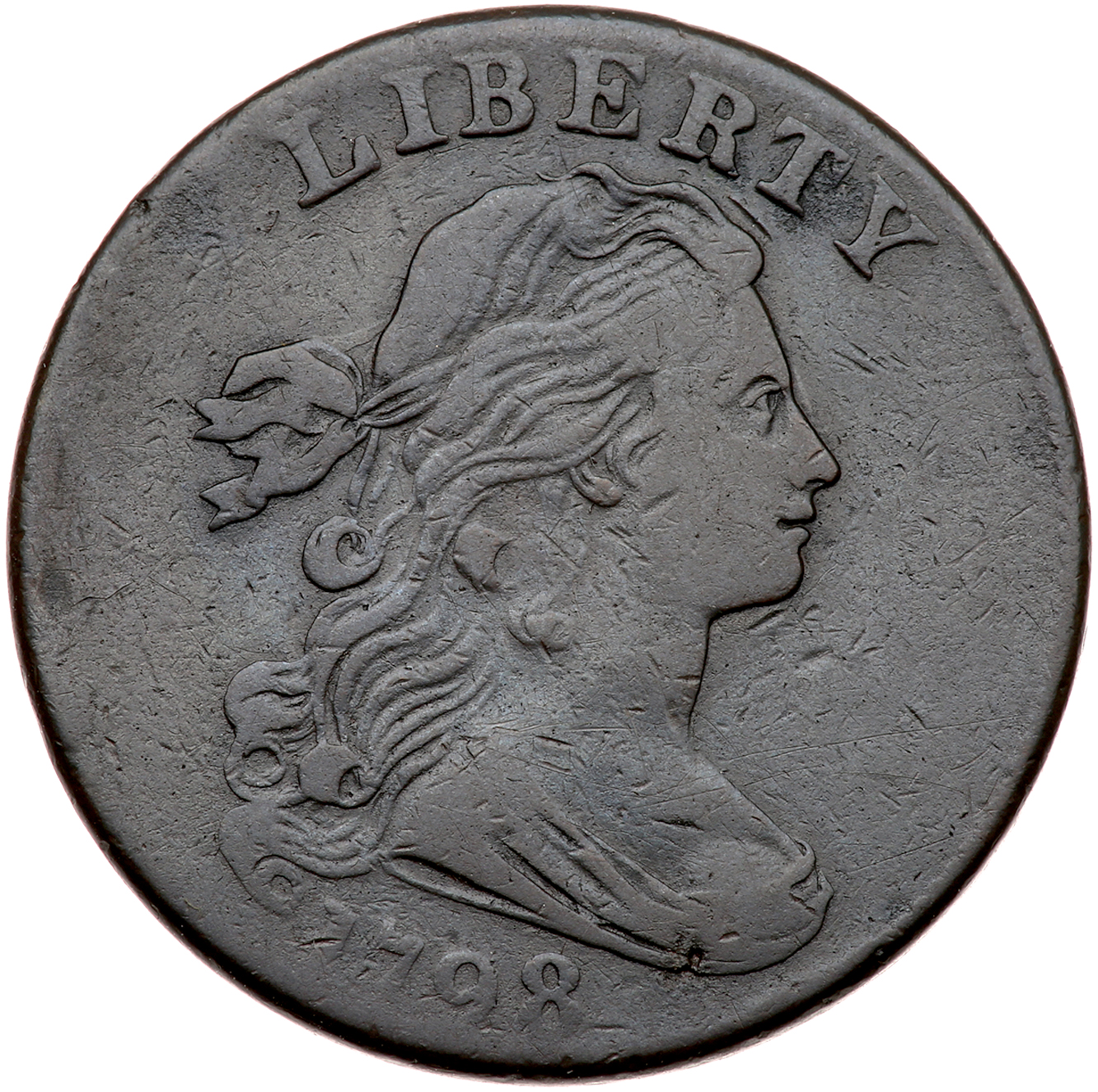 1798 S-180 R5+ Style II Hair, Small 8. PCGS graded VF-20. Glossy medium to dark chocolate brown. The surfaces are smooth and free of verdigris. Only minor marks, including a small pit on the lower edge of the bust, a diagonal nick under the T in LIBERTY, and a pair of dull nicks left of the first S in STATES. Very rare EDS, Breen state I, before any cracks or cud breaks on the reverse. A nice example of a variety that usually comes with significant surface problems. Graded VF20 net F12 and tied for CC#6 in the Noyes census, his photo #32855. Our grade is F15. The attribution and Reynolds provenance are noted on the PCGS Secure label. Pop 1; 3 finer at PCGS for the variety, 2 in EF45 and 1 in AU50 (PCGS # 36107) .