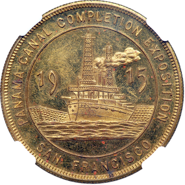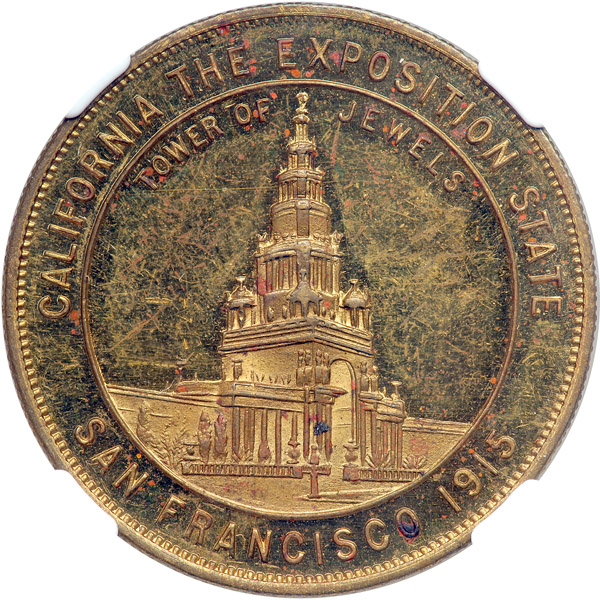 1915 SC$1 Tower of Jewels HK-416 Rarity 5. NGC graded MS-62 Prooflike. Gilt Brass Reeded Edge. 35mm. Panama Pacific Exposition. Glittering prooflike fields emphasize the devices very nicely.