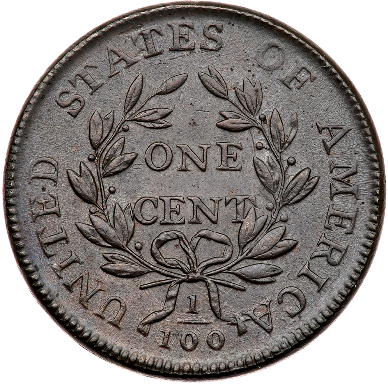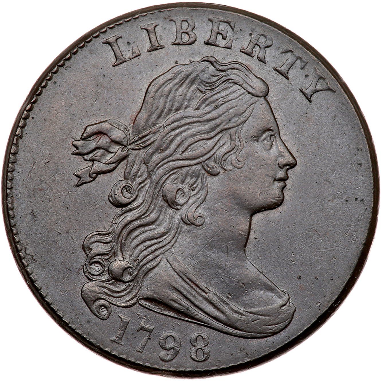 1798 S-184 R1 Style II Hair, Small 8. PCGS graded MS-62 Brown. CAC Approved. Choice frosty uniform steel and olive brown. Satiny mint luster covers the fields and protected areas and this cent offers excellent eye appeal. The only marks, and they are barely visible under magnification, are a faint diagonal hairline on the neck, a very light vertical nick on the jaw, and a tiny low spot at the left top of the second T in STATES (as struck). Sharply struck E-MDS, Breen state II. There are clear die clashmarks on the reverse and numerous microscopic chips under RT in LIBERTY, but no rim cuds on the reverse. Fine vertical die finishing lines show in the obverse fields. Graded MS60 net AU55 and CC#2 in the Noyes census, his photo #23321. Bland says AU55 and finest of the confirmed examples in his census. Our grade is AU58+, very close to mint state. Comes with a great provenance. The attribution and Reynolds provenance are noted on the PCGS Secure label. Pop 2; none finer at PCGS for the variety (PCGS # 36119) .
