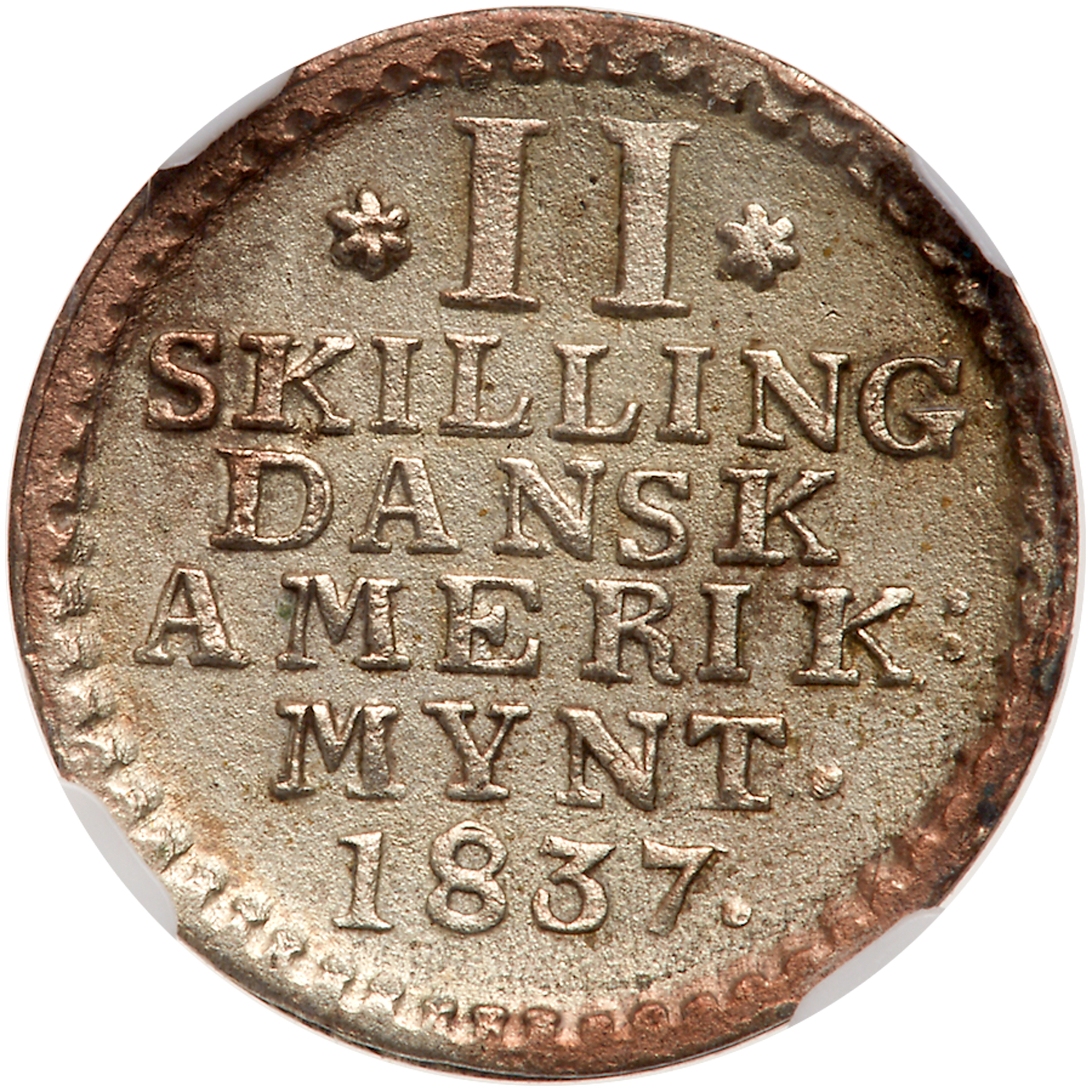 Danish West Indies. 2 Skilling, 1837. KM-13. Frederik VI. Flat Top 3. NGC graded MS-63. Estimate Value $200 - 250