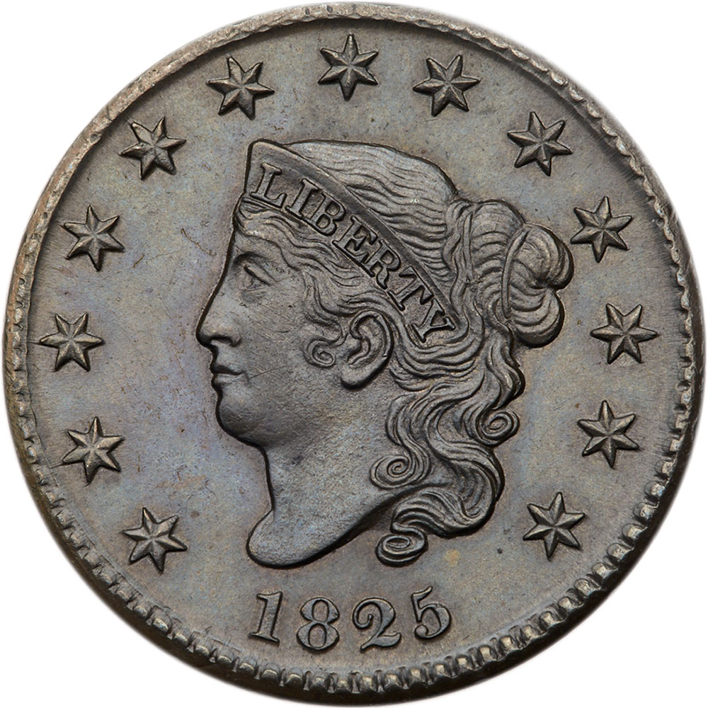 1825 N-9 R2. PCGS graded MS-62 Brown. Frosty medium steel and light olive. Satiny mint luster covers this cent and the eye appeal is excellent. Looks choice but there is a very light scuff of microscopic diagonal hairlines on the cheek. Otherwise this cent is flawless. The best identifying mark is a tiny spot of lighter tan toning over the right side of the 5. LDS with a fine die crack from the dentils over star 3 to the forelock. The die rust of the earlier die state has been polished off the die. A beautiful cent with solid mint state eye appeal. Graded AU55 net AU50 by Noyes, his photo #21242. Del Bland says MS60. Our grade is net AU58. Comes with a nice provenance. The attribution and Great Pacific Collection provenance are noted on the PCGS label. PCGS population 3; 9 finer: 2 in 63, 5 in 64, 2 in 65. (PCGS # 36805) Value $1,750 - UP