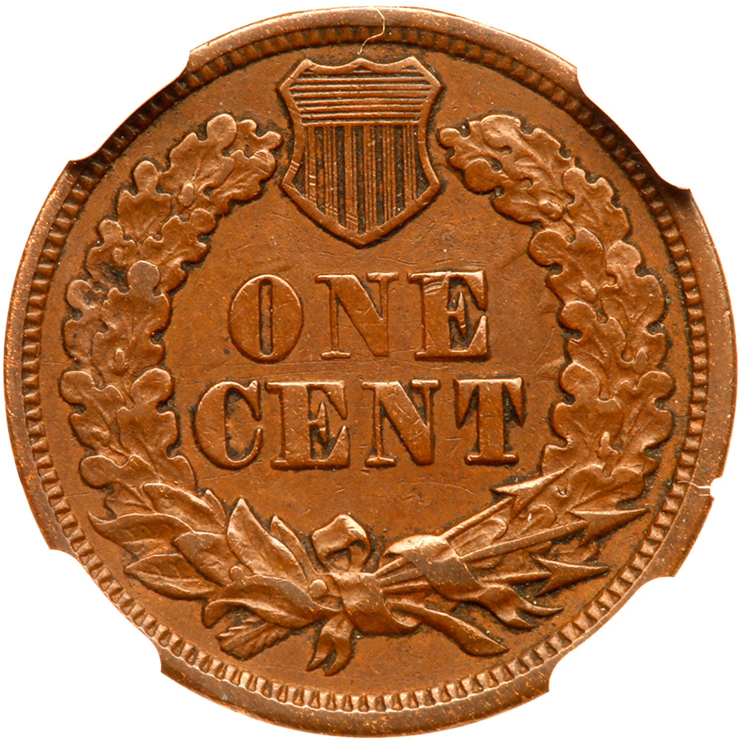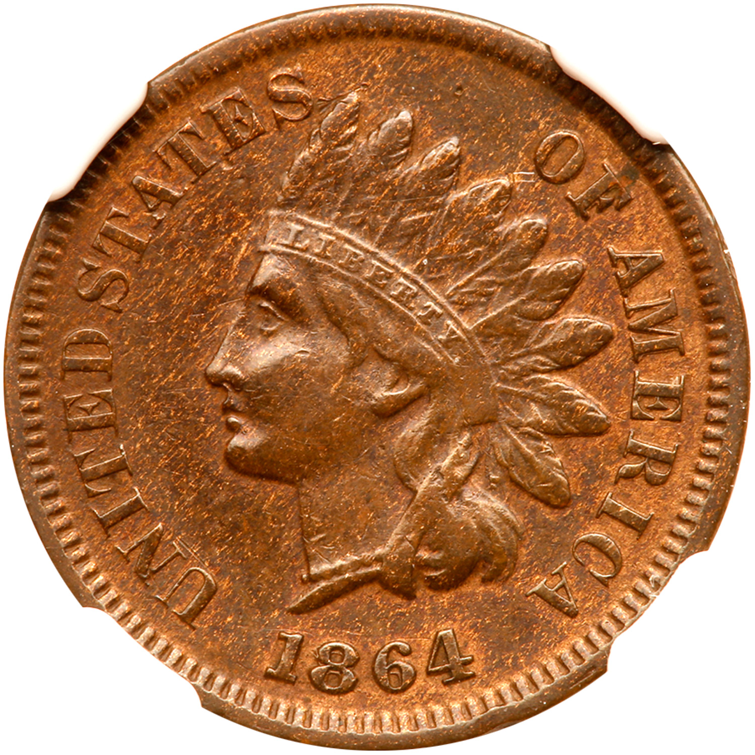 1864. Bronze, with "L". Snow-10. NGC graded AU-55 Brown. Bold repunched date. Our grade is VF. Estimated Value $80 - 100