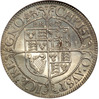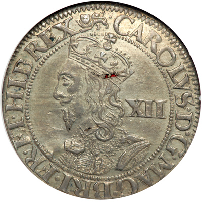 Great Britain. Shilling, ND. S.2871. Charles I, 1625-1649. Provincial issue. York mint, 1643-44. Mint mark, Lion. Crowned bust of King facing left, value XII behind head. Reverse EBOR above square-topped shield over cross fleury. Crisp strike with lovely original mint luster. Very rare in this grade. NGC graded MS-63.
