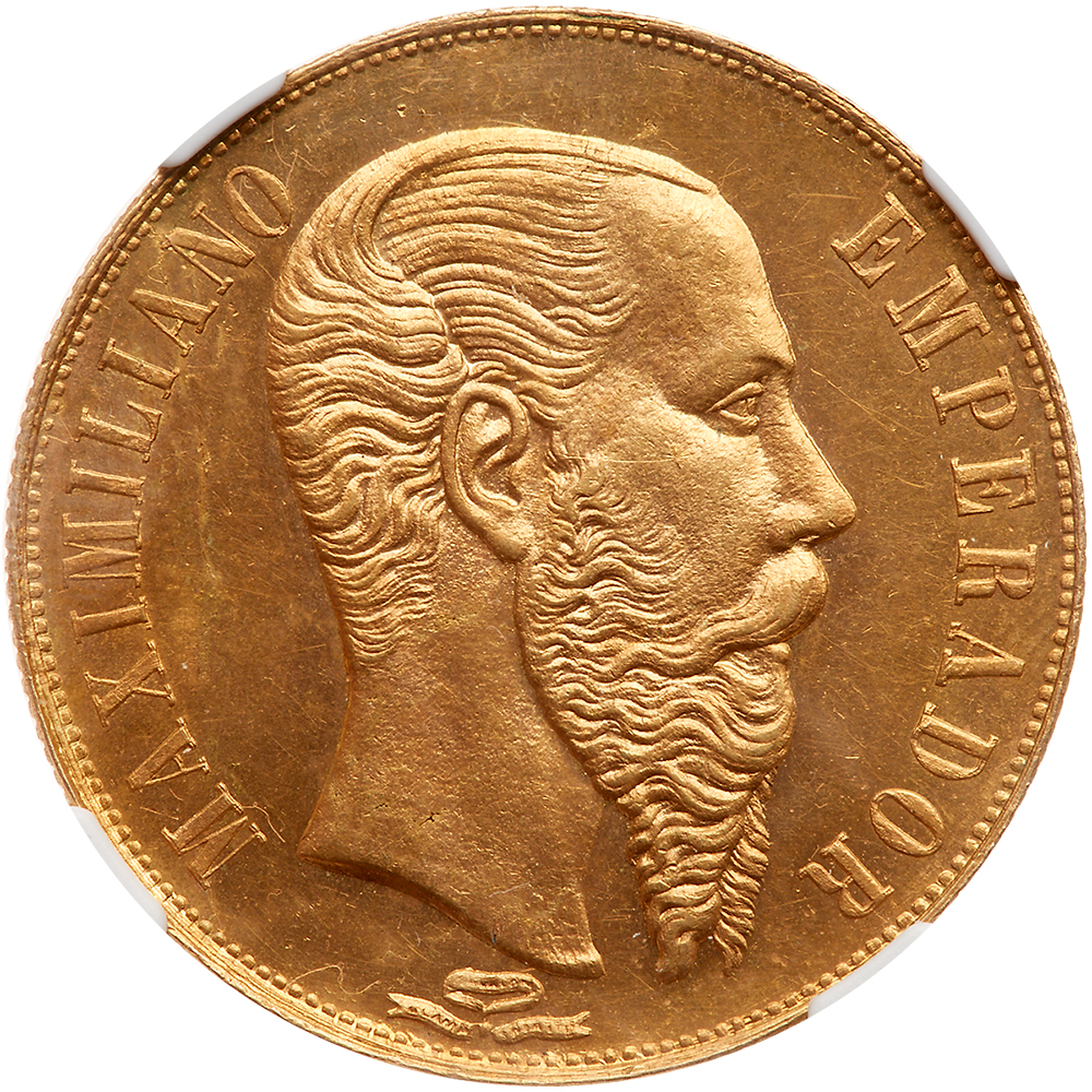 Mexico. 20 Pesos, 1866-Mo. Fr-62; KM-389. Maximilian I, 1864-1867. Head right. Reverse; Supported crowned arms. Natural striking flaw left of head. Sharply struck example, reflective surfaces and pleasing original mint fresh luster with great eye appeal. NGC graded MS-63. Estimate Value $4,000 - 5,000