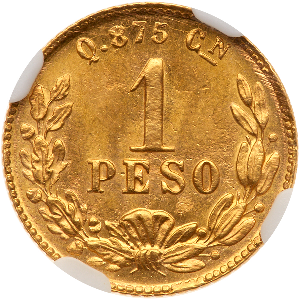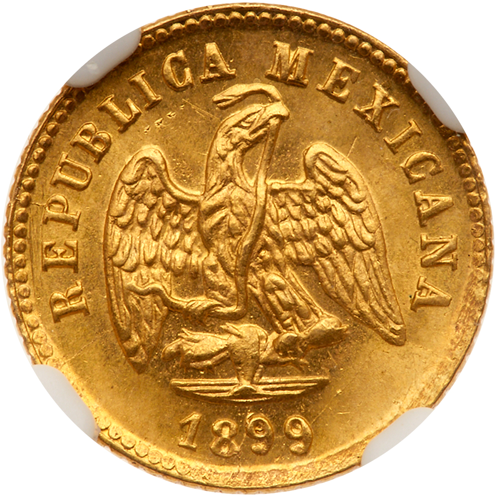 Mexico. 1 Peso, 1899-Cn Q. Fr-160; KM-410.2. 2,000 minted. Sharp with full mint luster. NGC graded MS-65. Estimate Value $400 - 500