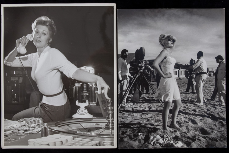 Kim Novak: Two Oversized Publicity Photos, One Very Rare On Set Photo in a Satin Chemise. Kim Novak: One of the great talents of the 1950s-60s with appeal to spare. Offered two oversized publicity photos. One finds her on the phone sitting on a roulette table with a huge pile of her winnings in silver dollars. But the best by far is a behind the scenes set photo likely from JEANNE EAGELS, of Novak on the beach, barefoot, wearing only a satin chemise staring at the distance. Photography by Van Pelt, dated 1957 and and absolutely fantastic. Estimate Value $500 - UP