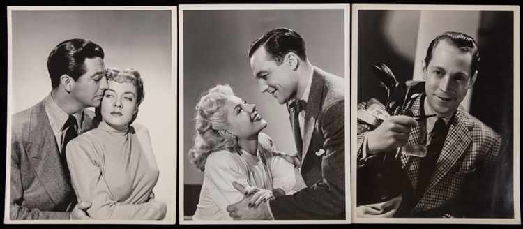 Nine (9) Male MGM Stars of the 30s - 40s Robert Taylor, Gene Kelley, Mickey Rooney and a Portrait of Franchot Tone by George Hurrell. Eight male star portraits. The best is of Franchot Tone Oscar nominated for MUTINY ON THE BOUNTY (1935), a beautiful 10 x 13" double weight, vintage original, silver gelatin portrait by acclaimed photographer George Hurrell. Stamped on verso "Kindly Credit Hurrell, M-G-M" with a press tag promoting Tone as MGM's "progressive young actor and soon to be seen in NO MORE LADIES with Joan Crawford." The balance are also MGM oversized, double weight studio portraits with studio notations that include Gene Kelly with Marie McDonald, Mickey Rooney with Ann Blyth, Alan Marshall, a very dapper Robert Young (most famous later for TV's "Marcus Welby: MD") and one single portrait of Robert Taylor and three with Audrey Totter. Estimate Value $500 - UP
