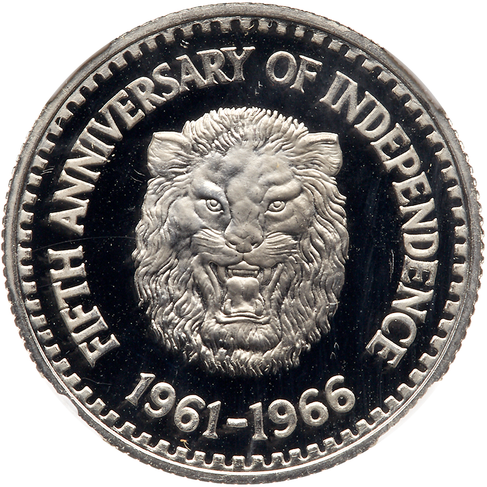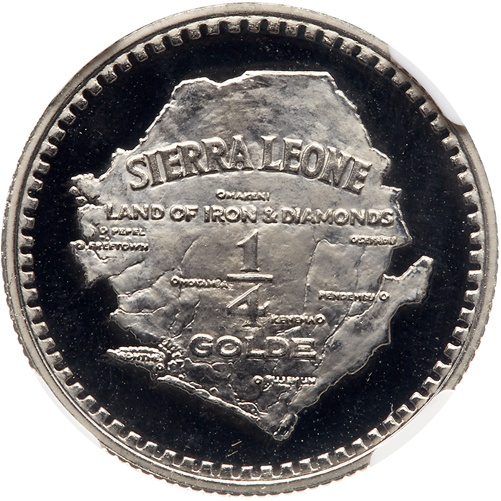 Sierra Leone. Palladium ¼ Golde, 1966. Fr-6; KM-22b. 10.3150 grams. For the 5th Anniversary of Independence. Value within map. Reverse; Lion head facing. Only 100 pieces struck. Very Rare. NGC graded Proof 69 Ultra Cameo. Estimate Value $500 - UP