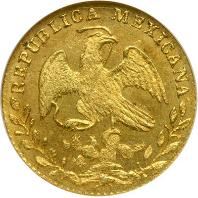 Mexico. 2 Escudos, 1863-Ga JG. Fr-91; KM-380.3. Hand with Liberty Cap over book. Reverse: Eagle facing right. A highly lustrous example. NGC graded MS-64.