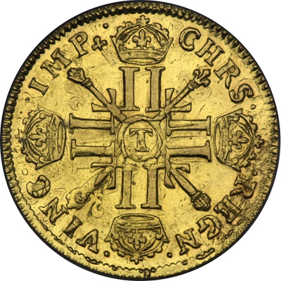 France. 1 Louis d'or, 1701-T (Nantes). Fr-436; Gad-253; KM-334.19. Mintmark, heart. Date not listed for the mint. Louis XIV. Old laureate head right with short hair. Reverse: Four cruciform crowned double L's over crossed insignia. Type "aux 8 L et aux insignes". Lustrous. PCGS graded AU-58.