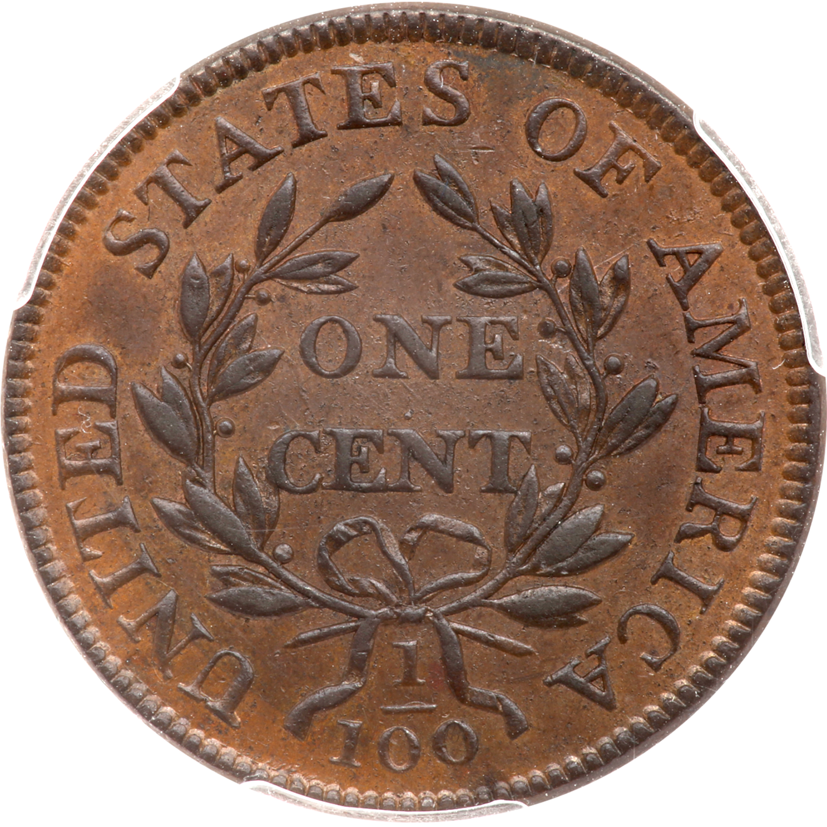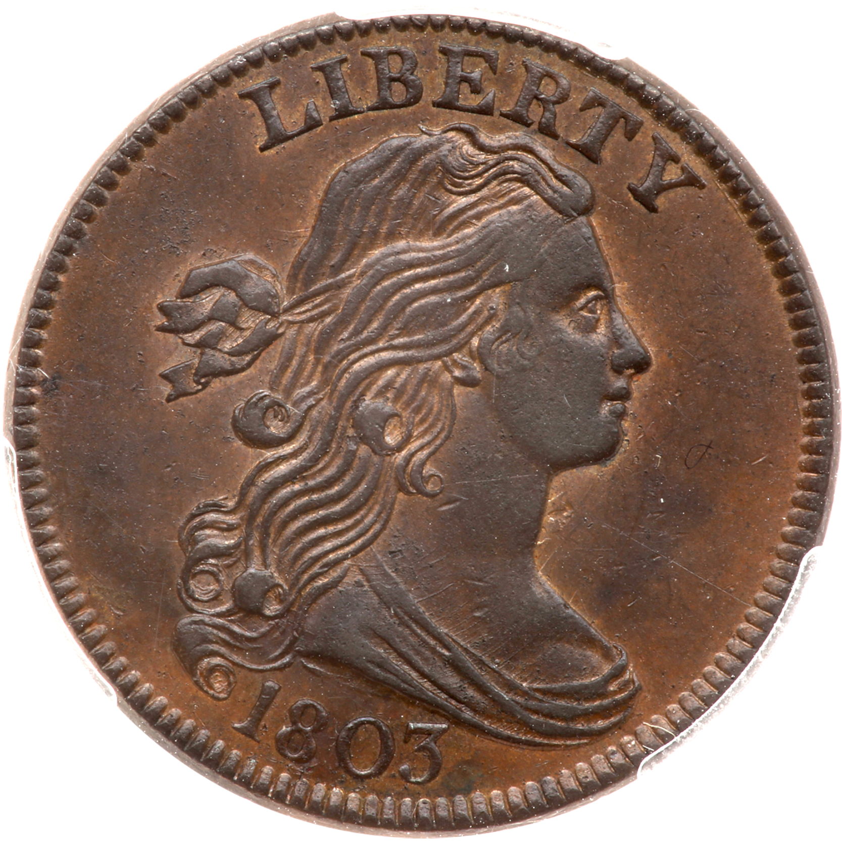 1803 S-257 R2 Small Date, Large Fraction. PCGS graded MS-62 Brown. CAC Approved. Frosty golden tan and light steel brown with darker steel brown toning on the highpoints of the devices. Mint luster covers the fields and protected areas on both sides and this cent offers outstanding eye appeal. The only marks, and they are microscopic, are a tiny planchet flake (as struck) in the field close before the neck, another at the dentils left of the lower end of the hair ribbon, and a collection of extremely faint ticks on the shoulder with another group of very fine ticks in the field over the upper end of the hair ribbon. Sharply struck EDS, Breen state I, with die clashmarks on both sides but no die cracks. Our grade is AU58, perhaps because we use a 16x glass, but this cent offers solid mint state eye appeal. The attribution and Reynolds provenance are noted on the PCGS Secure label. Pop 1; 1 finer in MS63+ at PCGS for the variety (PCGS # 36395) .
