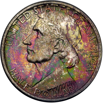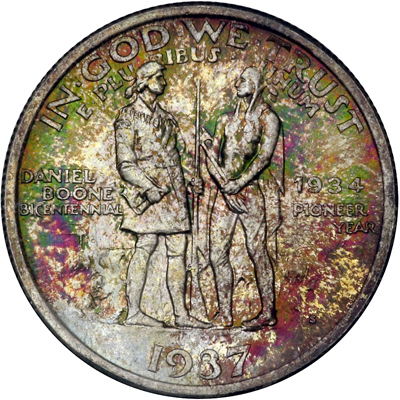 1937 Boone Half Dollar. MS-67. Monster rainbow iridescence on both sides. Estimated Value $750 - 900
