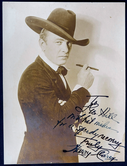 Carey, Harry (1878-1947) Silent film superstar; one of first stars of Westerns. Sepia-toned 7 x 9¼ in. photo inscribed and signed, "To L. Geo. Hill with best wishes for a speedy recording. Truly Harry Carey." Some age toning; several skips to ink. With a 7½ x 9½ in. photo of a scene from one of his movies. Estimated Value $200 - 300