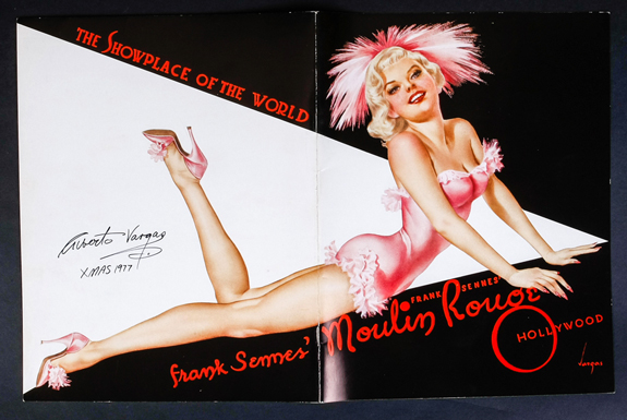 Frank Sennes' Moulin Rouge Hollywood. Frank Sennes' Moulin Rouge Hollywood. John F. Huber Publishing. 11x8.5 inch softcover playbill distributed beginning in the late 1950s with photos and descriptions of the performers and shows at the venue. Hand-signed and dated on verso by cover artist Alberto Vargas "Xmas 1977". Fine condition Est. $100-$250. Estimated Value $100 - 250