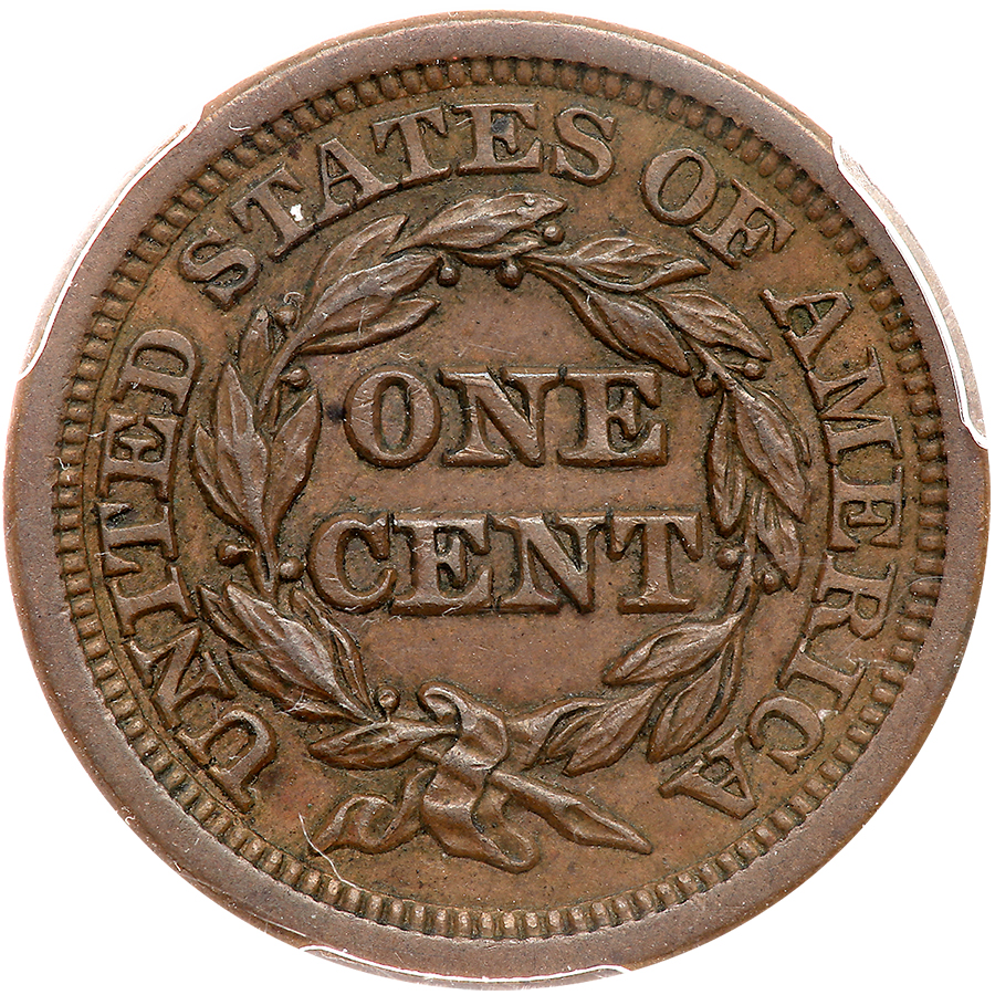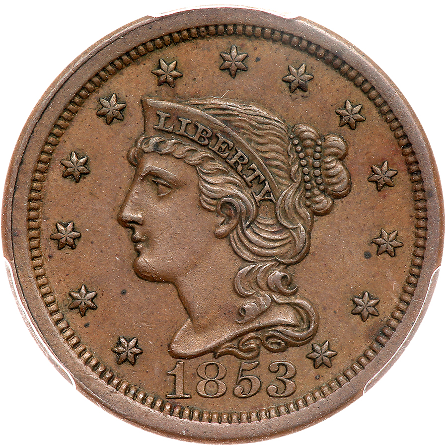1853 N-5 R2 Repunched 53 PCGS graded AU58, CAC Approved. Light to medium chocolate brown. No marks or other defects, but the luster is hidden under a thin layer of natural oxidation. This piece appears to have been untouched for many decades and shallow dirt is nestled around all the devices. Needs a proper bath to bring out the underlying beauty. The best identifying mark is a small spot of darker toning left of the lower left point of star 11 and another midway between star 2 and the chin. Nicely struck E-MDS, die state a. The fine repunching under the 3 is visible in spite of the dirt, and the fine die lines from the inner curl are present. Our grade is AU50. The attribution and Iskra provenance are noted on the PCGS label. PCGS population 1; 2 finer in 65 for the variety at PCGS. Estimated Value $200-UP