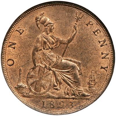 Great Britain. Penny, 1893. S.3954; KM-755. Victoria. Practically full luster. NGC graded MS-64 Red & Brown.