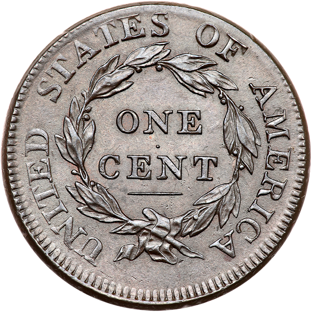 1810 S-282 R2. PCGS graded MS-64 Brown. CAC Approved. Very attractive lustrous light olive and chocolate brown with slightly lighter brown on the right side of the obverse. Hints of faded mint color can be found in protected areas around the wreath. No spots or stains, nearly flawless. A barely visible hairline on the jaw and a nick at the base of the inner point of star 5 are the only notable marks, and they are very easy to miss. MDS Breen state III. There are a couple light die cracks on the obverse and a raised ridge along the dentil tips over ATES OF. The stars before the portrait do not show their radial lines while the ones behind the portrait are fully struck, a result of dies that were out of proper axial alignment (the die faces were not perfectly parallel). In addition the reverse is rotated 25 degrees CW. Graded MS60 and CC#2 with only 2 mint state examples in the Noyes census, his photo #39146. Bland says MS60 and CC#3. Our grade is MS60. The attribution and Reynolds provenance are noted on the PCGS Secure label. Pop 1; none finer at PCGS for the variety (PCGS # 36475) .