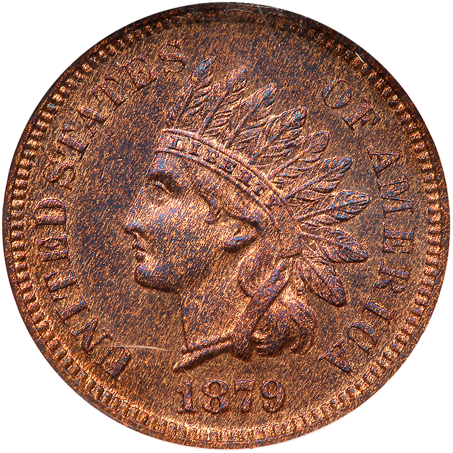 1879. NGC graded Proof 65 Red & Brown. Mottled gold and purple tone. Only 3,200 struck. In an NGC Old Style Holder. Pop 77; 38 finer for PFRB at NGC, 34 in 66, 2 in 66 Star, 2 in 67. Estimated Value $480 - 500