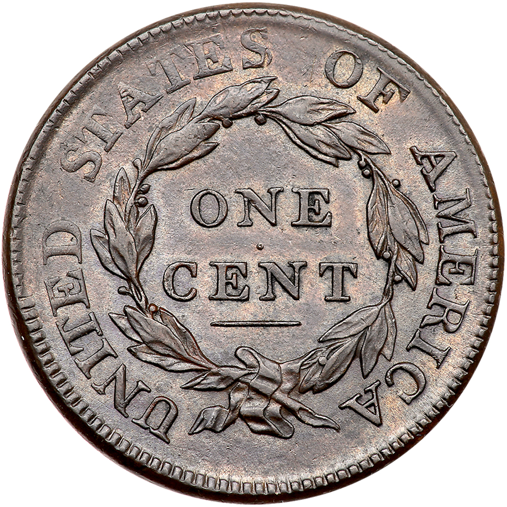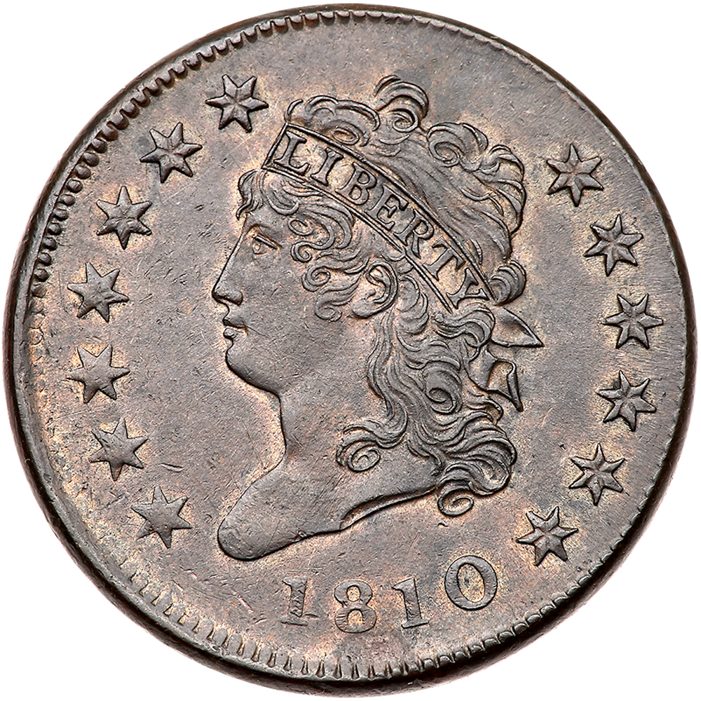 1810 S-283 R2. PCGS graded AU-58+. CAC Approved. Glossy medium chocolate and steel brown with frosty lighter steel brown faded down from mint color in protected areas. Mint luster covers the fields and protected areas on both sides and this cent offers excellent eye appeal. No spots or stains, only a few very light contact marks. The notable ones are a pair of very light, dull scratches in the field over the bust and a nick over star 1. E-MDS Breen state II, showing die clashmarks on both sides. Myriad fine die preparation lines cover the face and neck. These lines are seldom seen because they only show on high grade early state pieces which are quite rare. This is the toughest 1810 variety to fine in top grades. Graded AU50 net EF45 and tied for CC#6 in the Noyes census, his photo #61027. Our grade is AU55. The attribution and Reynolds provenance are noted on the PCGS Secure label. Pop 1; 1 finer in MS62 at PCGS for the variety (PCGS # 36478) .