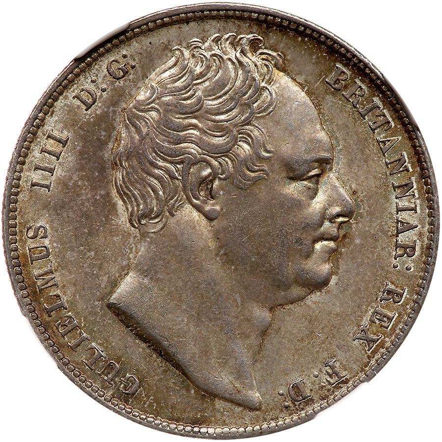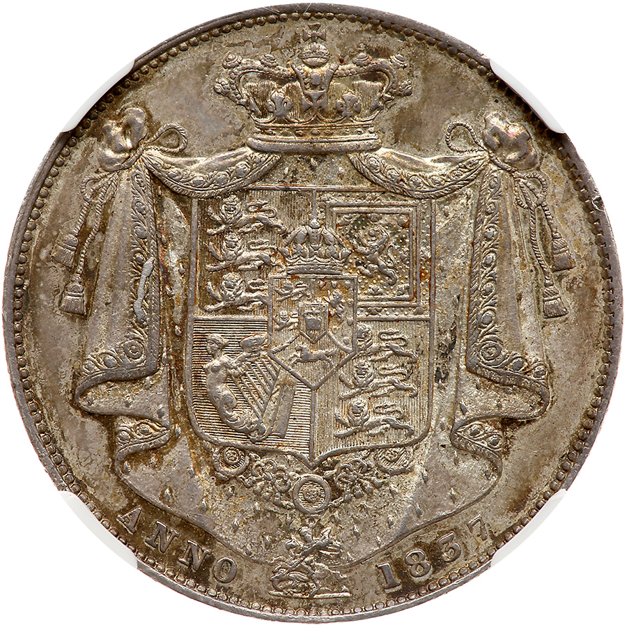 Great Britain. Halfcrown, 1837. S.3834; KM-714.2; ESC-667. William IV. Light olive green tone with underlying luster. NGC graded AU-58 Gold Sticker. WINGS Approved.