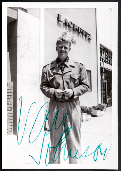 Johnson, Van. Van Johnson Signed Photo. Original vintage black and white candid photograph of the musical comedy star hand-signed in Beverly Hills circa 1940s. 5x3.5 inches. Fine condition. Estimated Value $75 - 100
