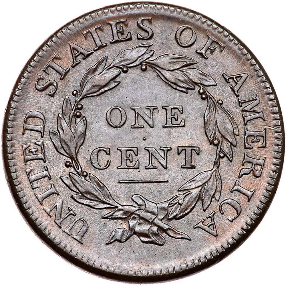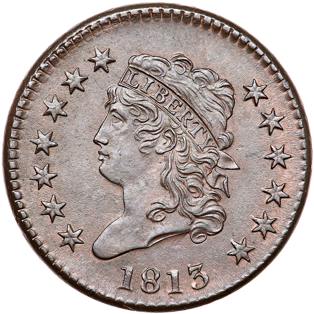 1813 S-292 R2. PCGS graded MS-63 Brown. CAC Approved. Lustrous chocolate brown and steel with lighter steel brown toning in protected areas. A very attractive cent, essentially flawless. The notable marks are a microscopic planchet flake under the left foot of the second 1 in the date and a tiny tick on the jaw over the throat. E-MDS, Breen state II, with die clashmarks on both sides and light flowlines in the fields. Graded MS60 and CC#2 in the Noyes census, his photo #34165. Bland says AU55 and tied for CC#4. Our grade is MS60. The attribution and Naftzger-Reynolds provenance are noted on the PCGS Secure label. Pop 2; none finer at PCGS for the variety (PCGS # 36511) .
