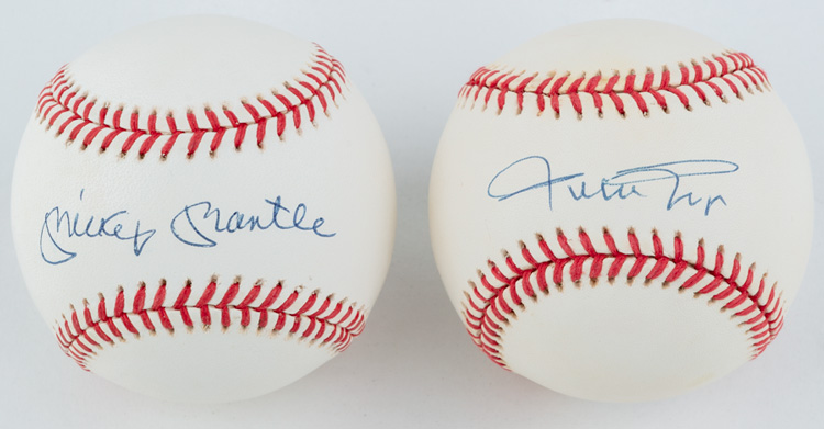 Hall of Famers Mickey Mantle and Willie Mays; Individually Signed Baseballs Certified by JSA. Two exceptionally clean signed baseballs. Mickey Mantle has signed an Official American League Rawlings (Costa Rica) ball in blue ball point pen. Willie Mays has signed an Official National League Rawlings ball also in blue ballpoint pen. Both baseballs have been certified authentic and come with Loas from James Spence. Estimate Value $500 - UP