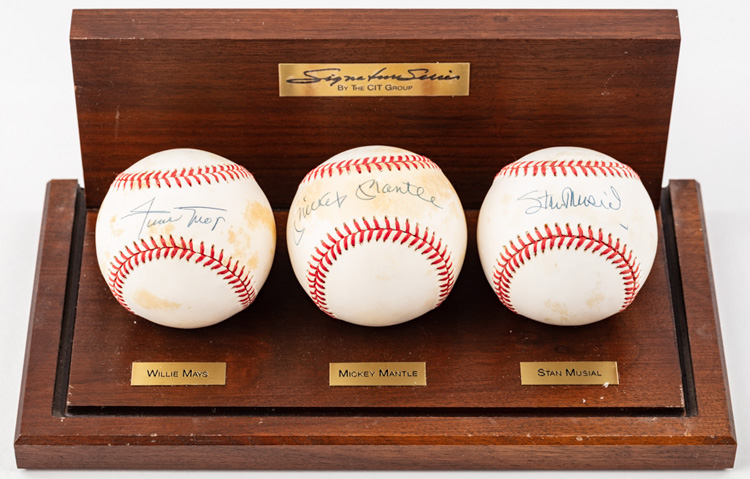 Mickey Mantle, Stan Musial and Willie Mays Signed Baseballs On Custom Wood Stand, Certified by James Spence Authentication. Three signed baseballs by Willie Mays, Mickey Mantle and Stan Musial, part of the Signature Series by CIT Group. All three have been certified very recently by JSA Authentication with Mays and Mantle having JSA's signed Letters of Authentication as well. Excellent condition. Estimate Value $700 - UP
