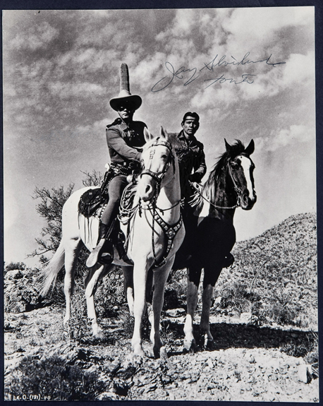 Silverheels, Jay. Glossy cardstock 10x8 inch promotional photo of The Lone Ranger and Tonto signed by actor Jay Silverheels. In Fine condition. Estimated Value $350 - 450